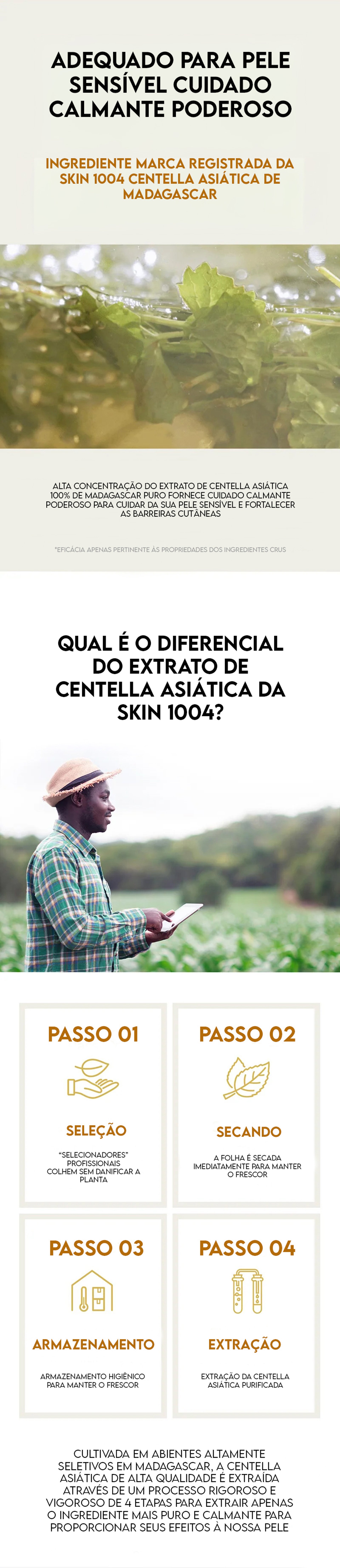 Ampola Feita com 100% de extrato de centella asiática de Madagascar, fresco da natureza intocável de Madagascar, que acalma, suaviza e purifica a pele.