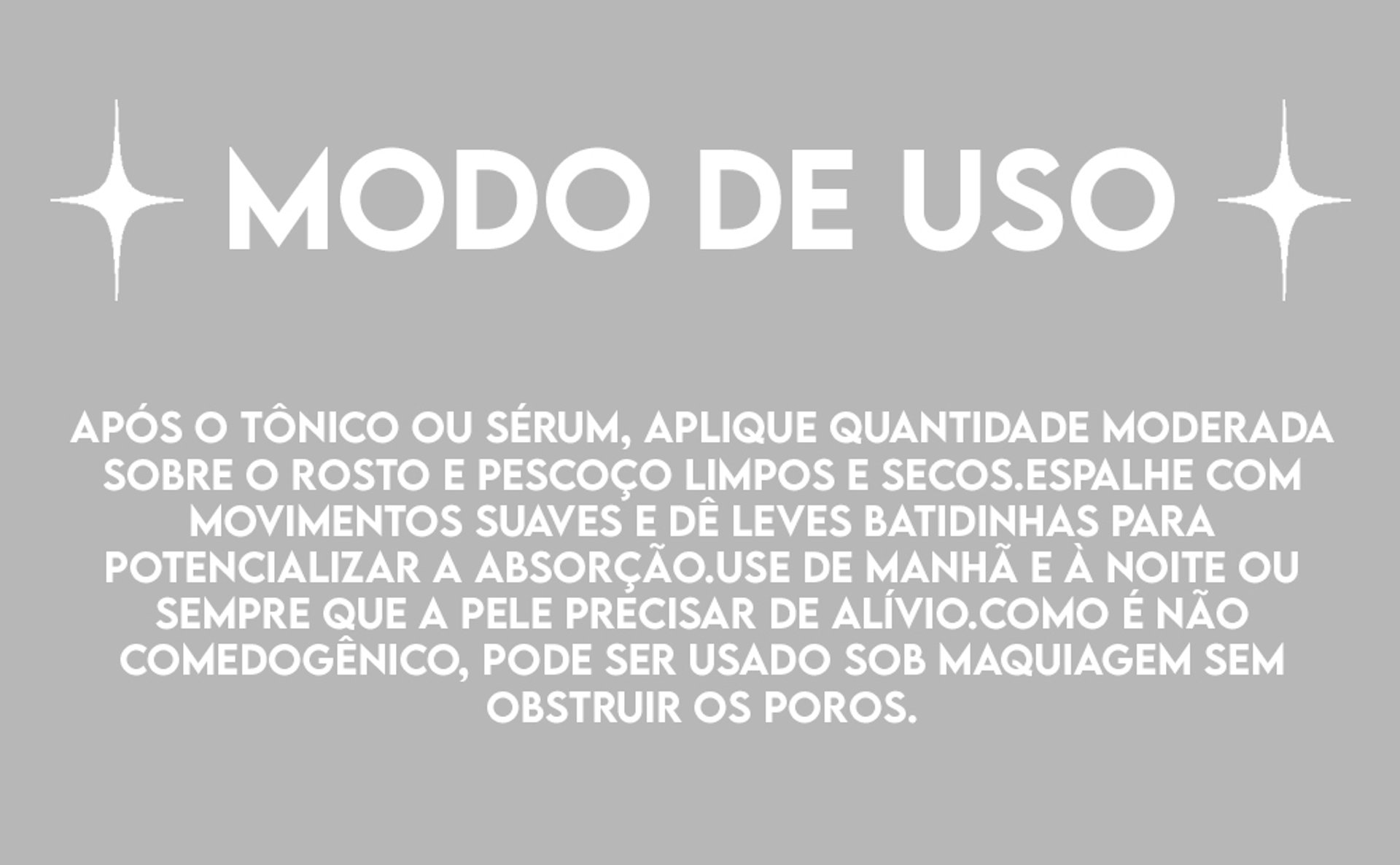 Use de manhã e à noite ou sempre que a pele precisar de alívio.