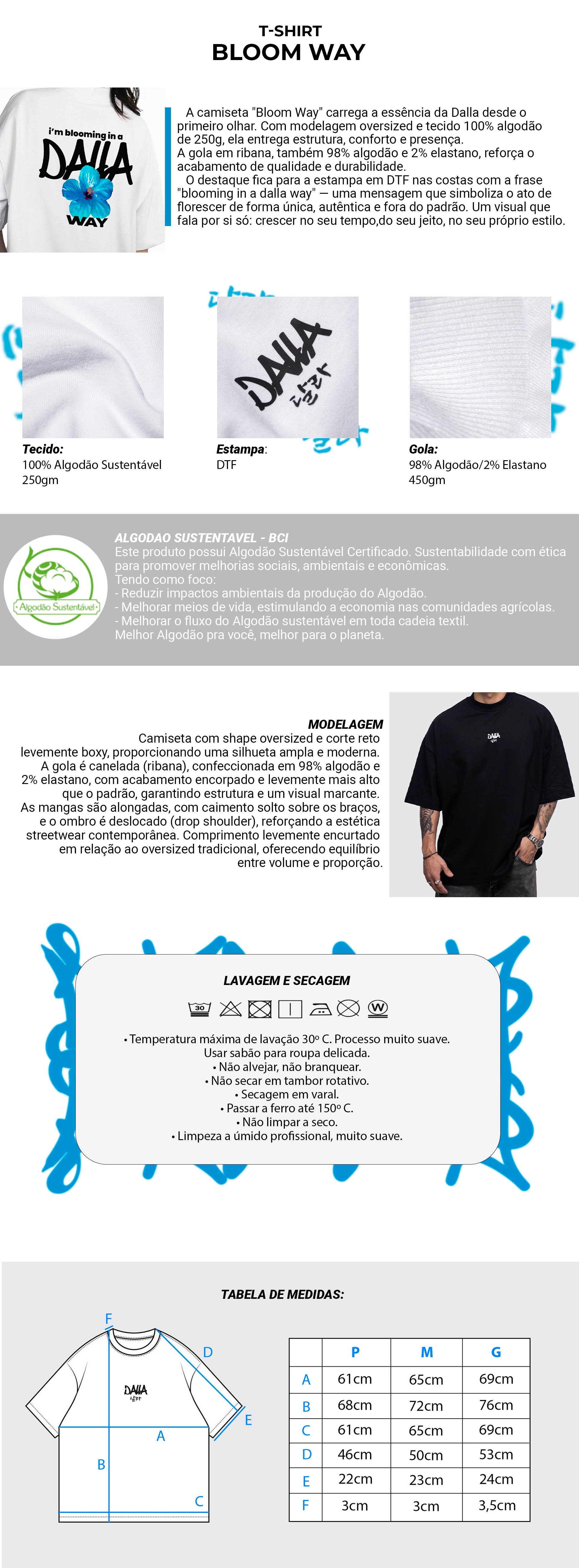 🌺 Dalla - Bloom Way Dalla - pronuncia em coreano que significa “diferente” — e essa é a essência que move a marca. Mais do que streetwear, a Dalla nasce com o propósito de ressaltar a individualidade e celebrar as diferenças. Com modelagem própria, cortes modernos e uma estética urbana autêntica, cada peça é feita para quem não se encaixa em padrões, mas cria os seus próprios.A camiseta "Bloom Way" traz esse espírito à flor da pele. Feita em 100% algodão de 250g, ela tem caimento estr...