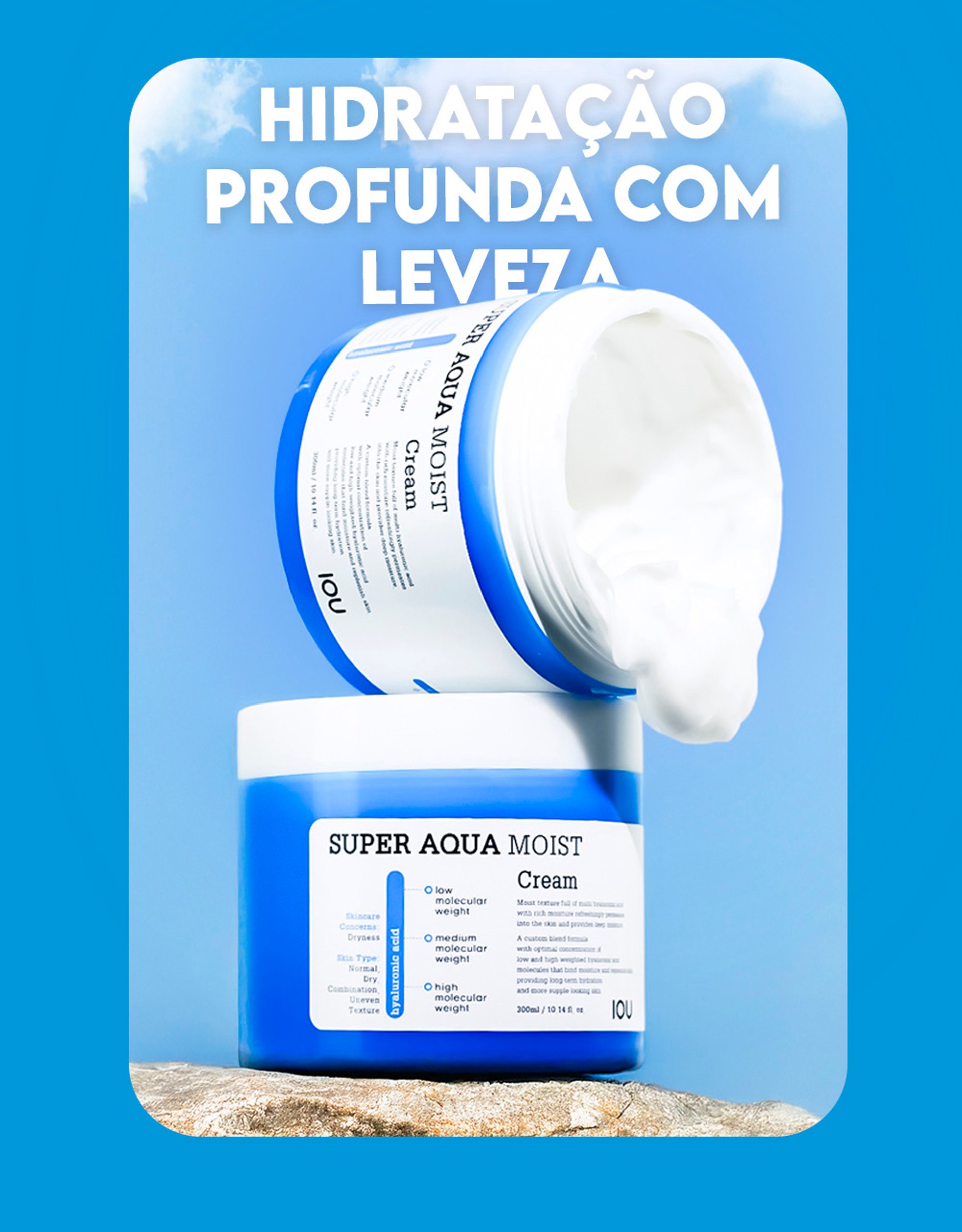 O Creme Facial Super Aqua Moist da marca sul coreana IOU possui 8 tipos de Ácidos Hialurônicos em diferentes pesos moleculares que permeiam profundamente na pele para fornecer umidade e prevenir o aparecimento de rugas e linhas finas. Devido a sua textura leve o creme é rapidamente absorvido pela pele, hidratante e deixando uma aparência saudável sem pesar ao longo do dia. Recomendado para Peles Sensíveis e Secas. Recomendado para quem:- Sofre com ressecamento extremo e sensação de rep...