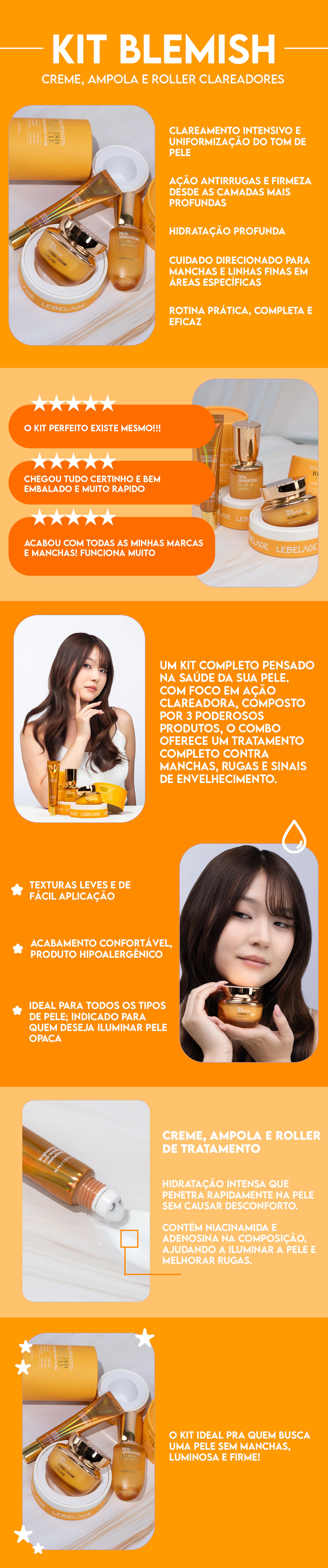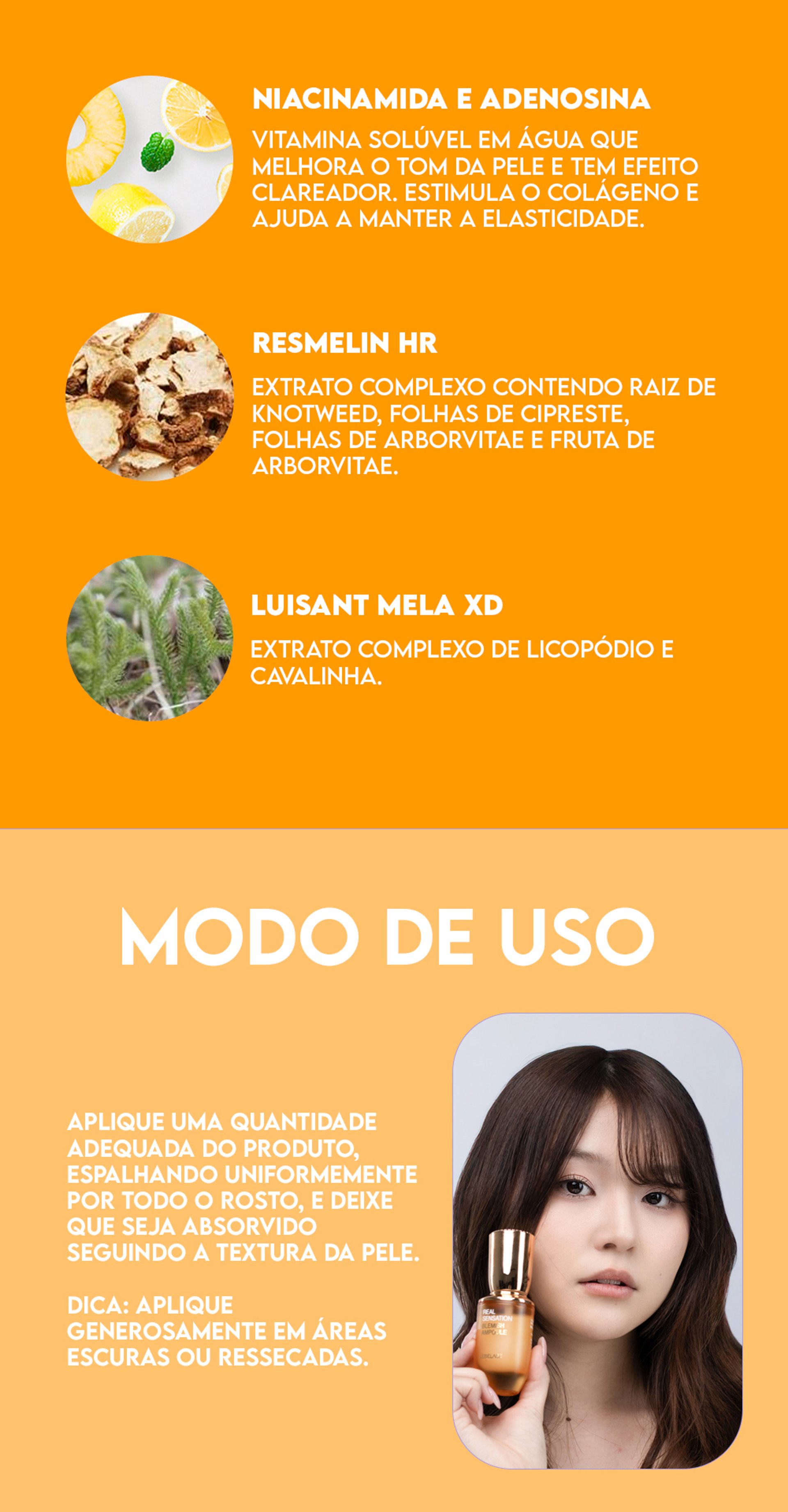 - Lebelage Real Sensation Ampola de Tratamento para ManchasCom a pele limpa, aplique de 2 a 3 gotas na pele do rosto e espalhe com movimentos suaves, espere secar e finalize com um creme hidratante de sua preferência.- Lebelage Real Sensation Creme de Tratamento para Manchas 50gDepois de lavar o ros...