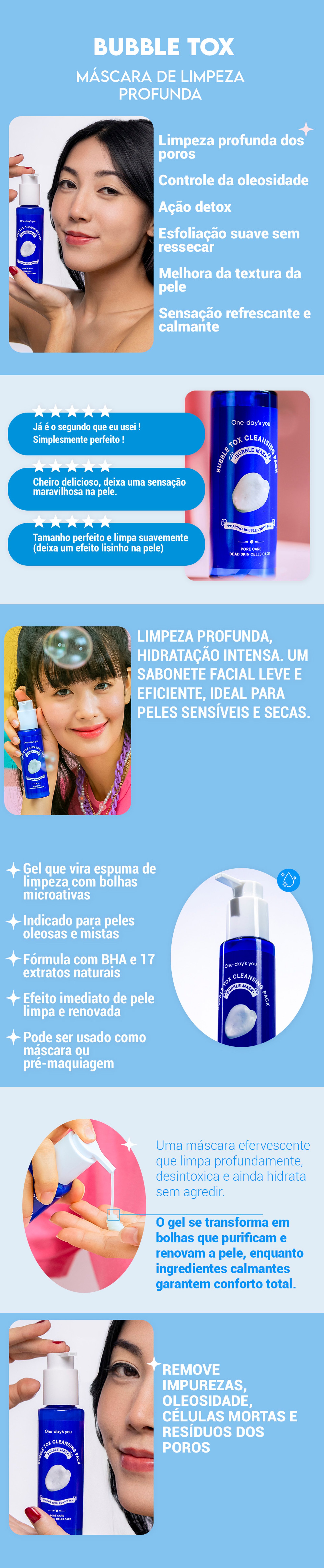 Limpeza profunda com bolhas que purificam e hidratam a pele sem agredir!O Bubble Tox Cleansing Pack da One Day’s You é uma máscara de limpeza com ação esfoliante suave, ideal para peles oleosas e mistas. Sua fórmula inovadora contém 17 extratos naturais e BHA (ácido salicílico), que atuam diretamente nos poros e na textura da pele.Ao ser aplicado, o gel se transforma em microbolhas efervescentes, que explodem suavemente, removendo impurezas, oleosidade, células mortas e resíduos dos poros, enqua...