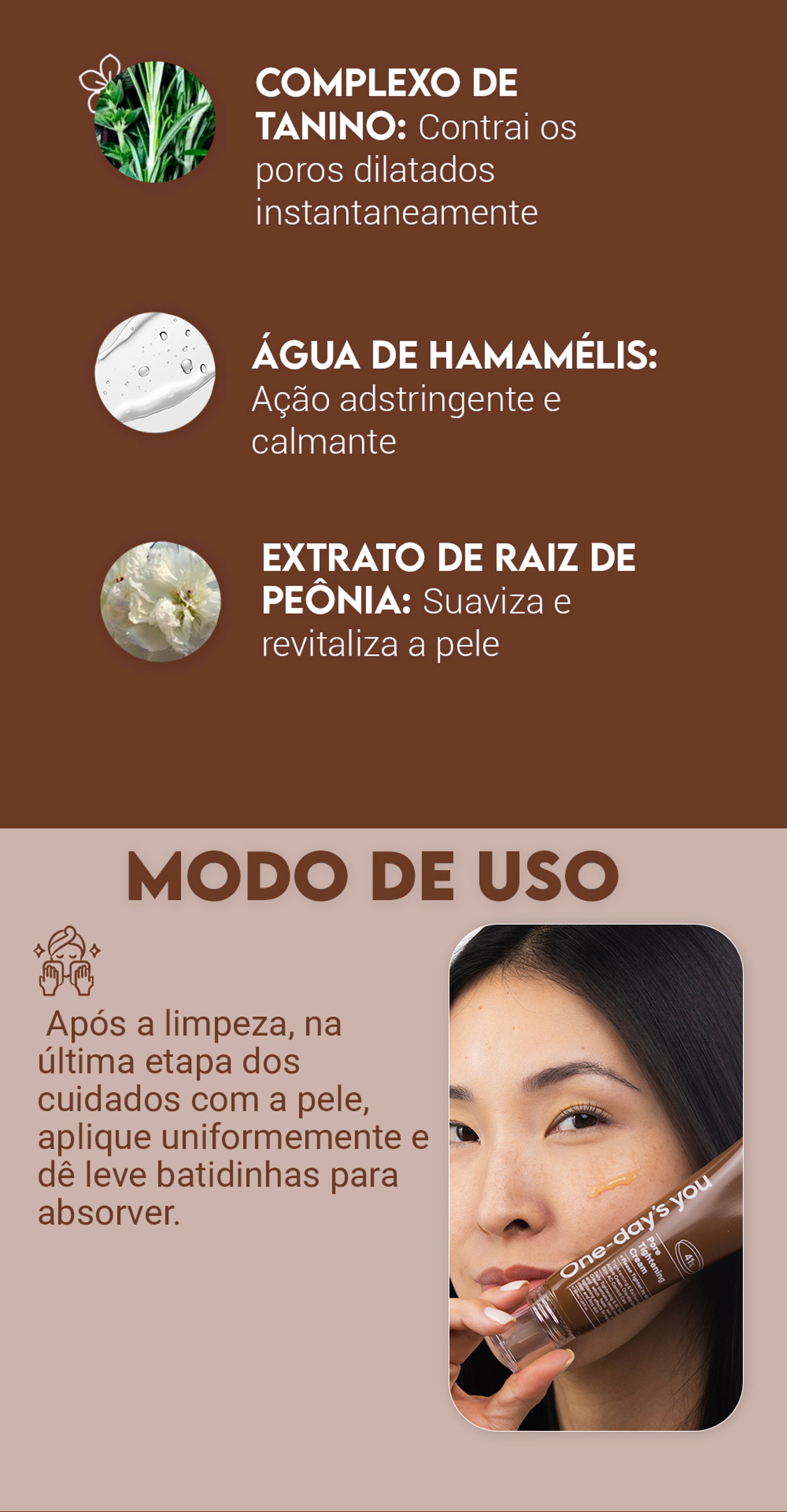 Modo de usar: Após a limpeza, na última etapa dos cuidados com a pele, aplique uniformemente e dê leve batidinhas para absorver.