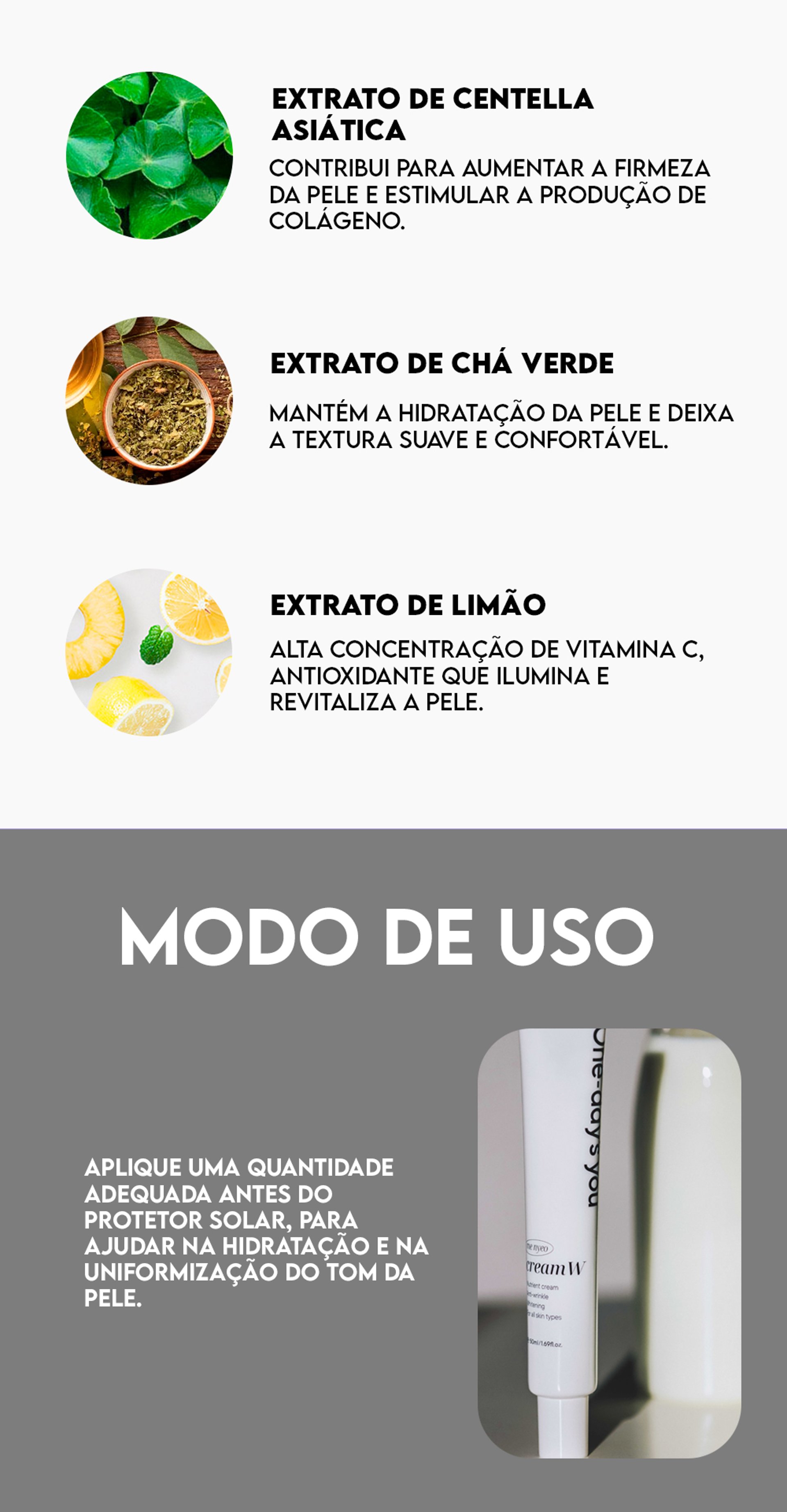 É um creme leve que ajuda a clarear a pele naturalmente deixando um efeito glow saudável. Adere facilmente na pele e espalha super fácil. Tem textura leve e entrega para todos os tipos de pele: Nutrição, redução de linhas finas e clareamento. 5 tipos de ingredientes que ajudam a pele a ficar saudável e radiante. ✔️ Devolve vitalidade para a pele;✔️ Formulado com Extrato de leite que hidrata a pele profundamente; ✔️ Contém Pantenol que ajuda a cuidar da pele sensibilizada e proteger ...