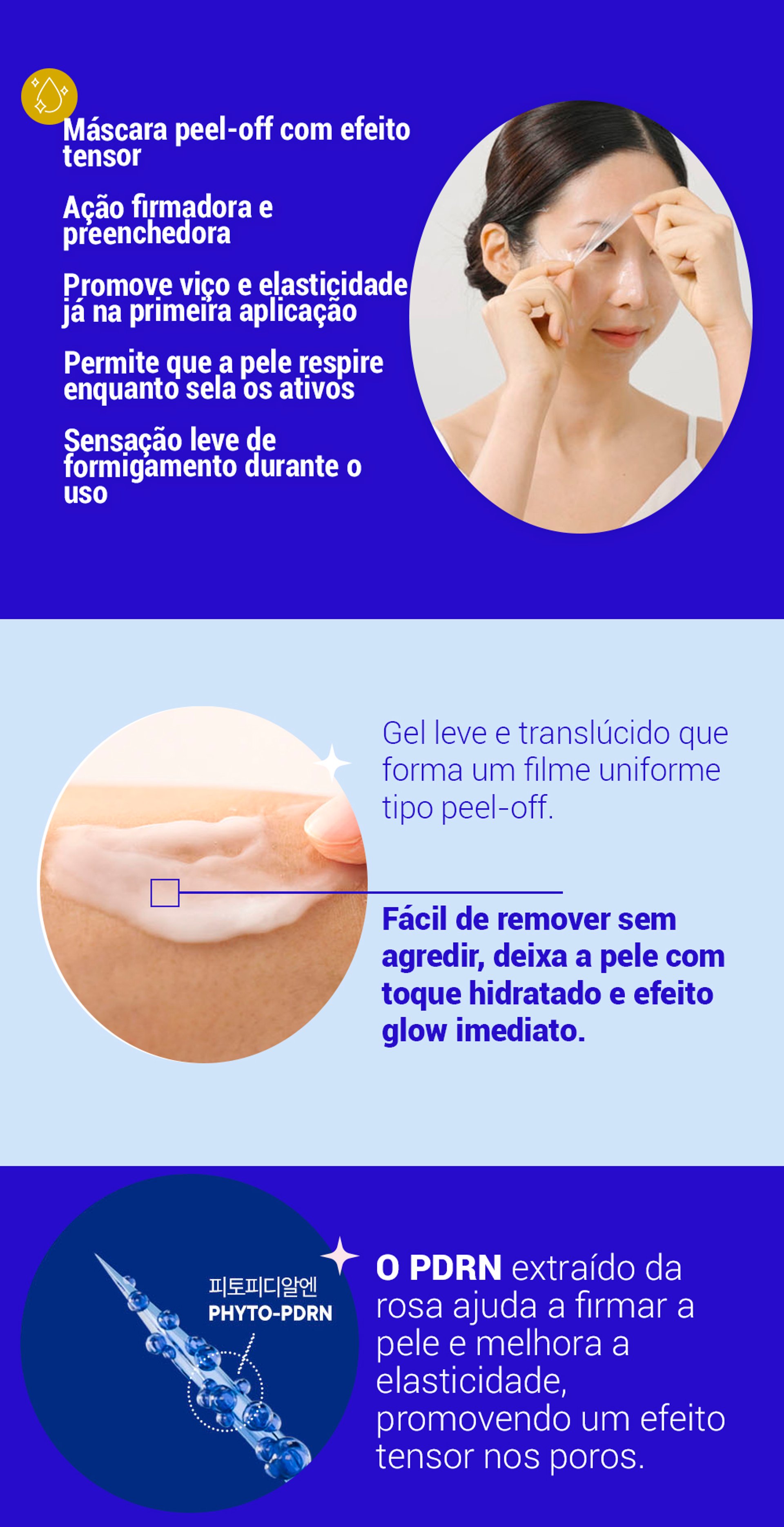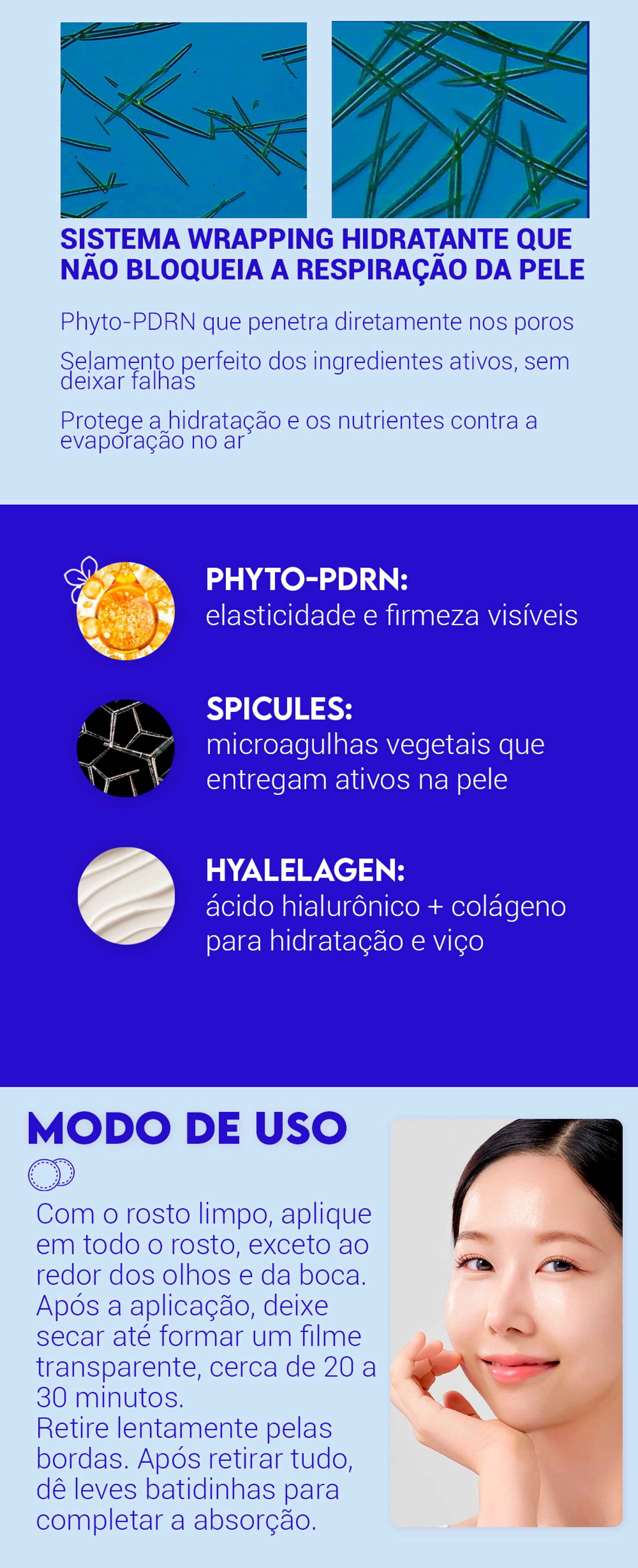Elasticidade radiante que preenche a pele de dentro para fora!Uma barreira hidratante luminosa que você sente no exato momento da remoção da máscara.Ajuda a recuperar a firmeza da pele flácida e cansada de dentro para foraNo momento em que é removida, revela uma pele mais luminosa e revitalizada, enquanto preenche com firmeza desde as camadas mais profundas. Benefícios- Firmeza da pele entregue pelo Phyto-PDRN- Mesmo após uma única aplicação, uma melhora de 59,51% no brilho e viço da pele- ...