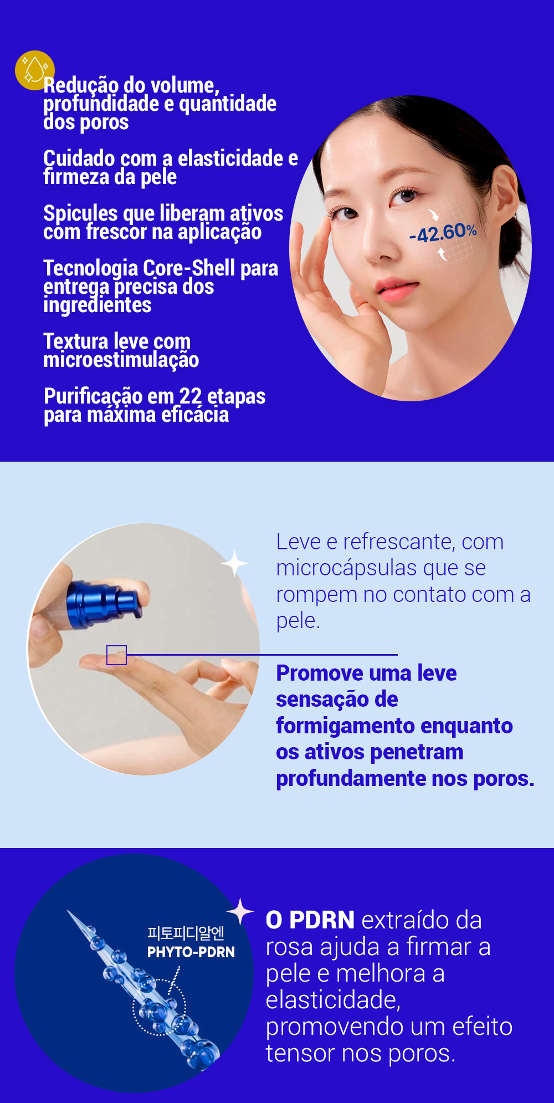 Ação direta, mais profunda e rápida!Dupla ação para firmeza dos poros!A revolução no fechamento dos poros! ! Efeito tensor imediato nos poros!Redução de 42,60% no volume dos poros com apenas 1 aplicação!Mesmo com os poros dilatados, são visivelmente reduzidos com um efeito tensor poderoso e imediato. Ponto 01Cuidado intensivo dos poros com Phyto-PDRNPonto 02Firmeza dos poros visível mesmo após uma única aplicaçãoPonto 03Tecnologia de cápsulas com estrutura Core-Shell (núcleo e camada extern...