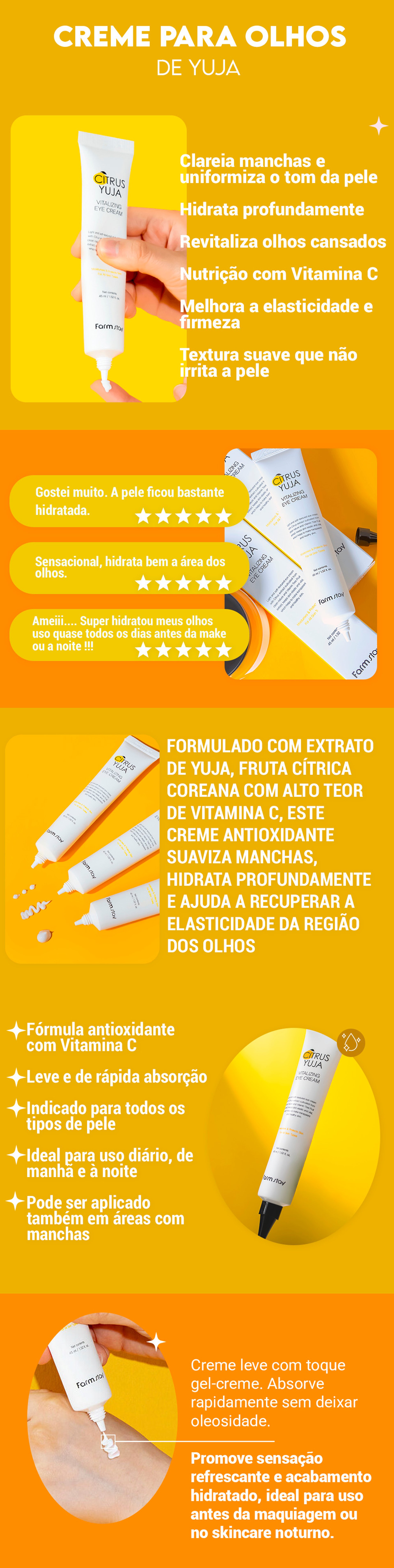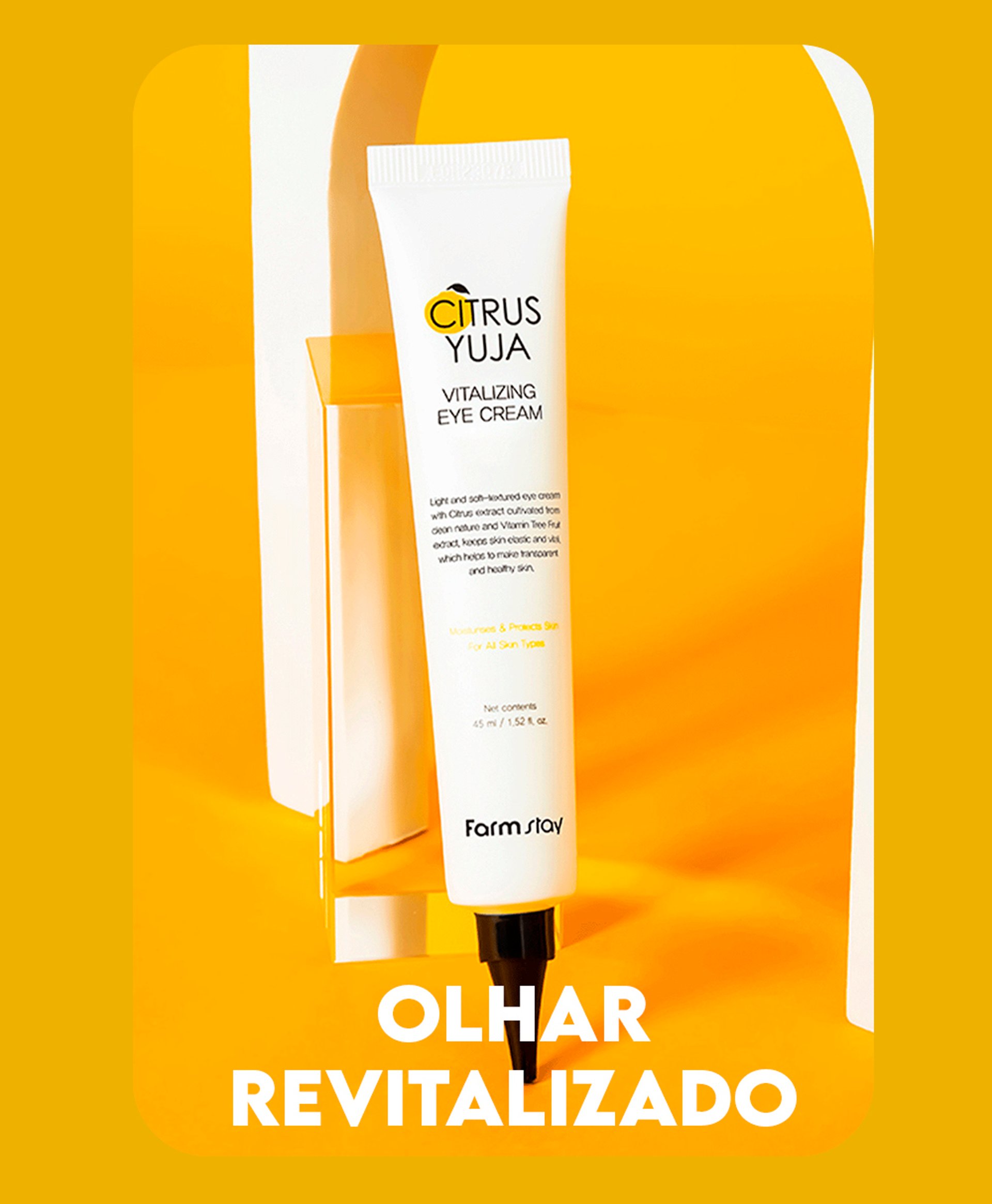 O que é? O Creme para Olhos de Yuja da Farmstay é um creme de tratamento antioxidante para a área dos olhos formulado com Adenosina extrato de Yuja, uma fruta conhecida por possuir até 3x mais Vitamina C do que o limão.Possui textura leve que é rapidamente absorvida e a sua nutrição penetra profundamente na pele, resultando em uma aparência mais uniforme, saudável e hidratada. Recomendado para todos os tipos de pele. Benefícios: • Reduz manchas na pele• Hidrata profundamente•...