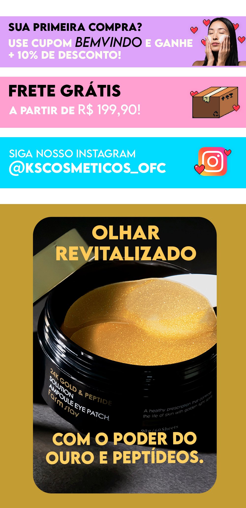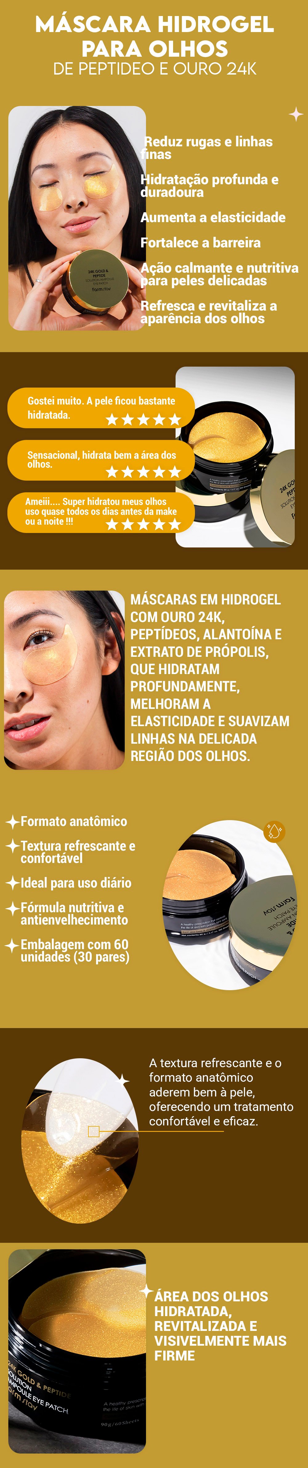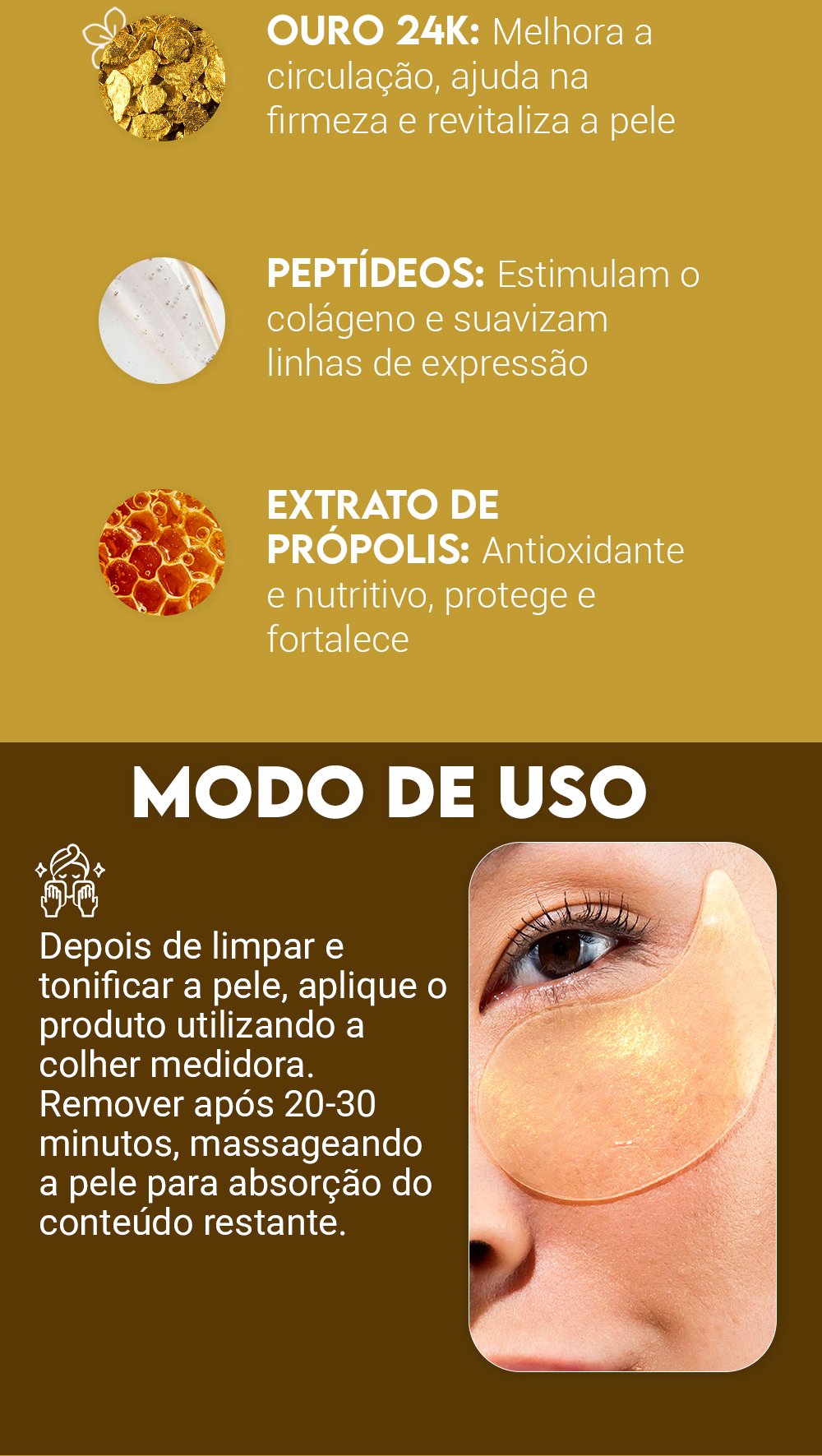 Máscaras para a área dos olhos com ouro embebidas em ampolas com peptídeos, alantoína e extrato de própolis para hidratar e tratar rugas e linhas finas na região dos olhos.