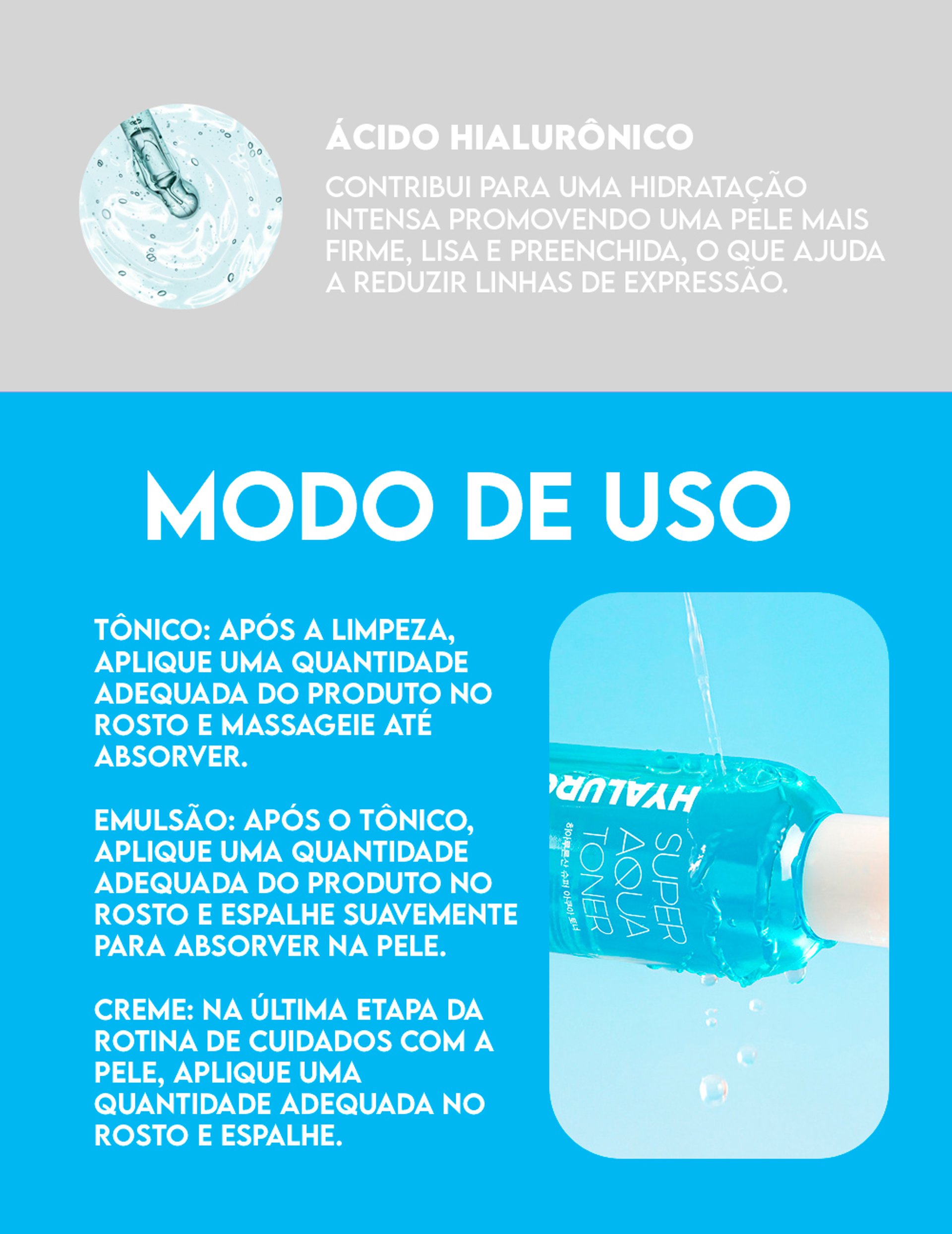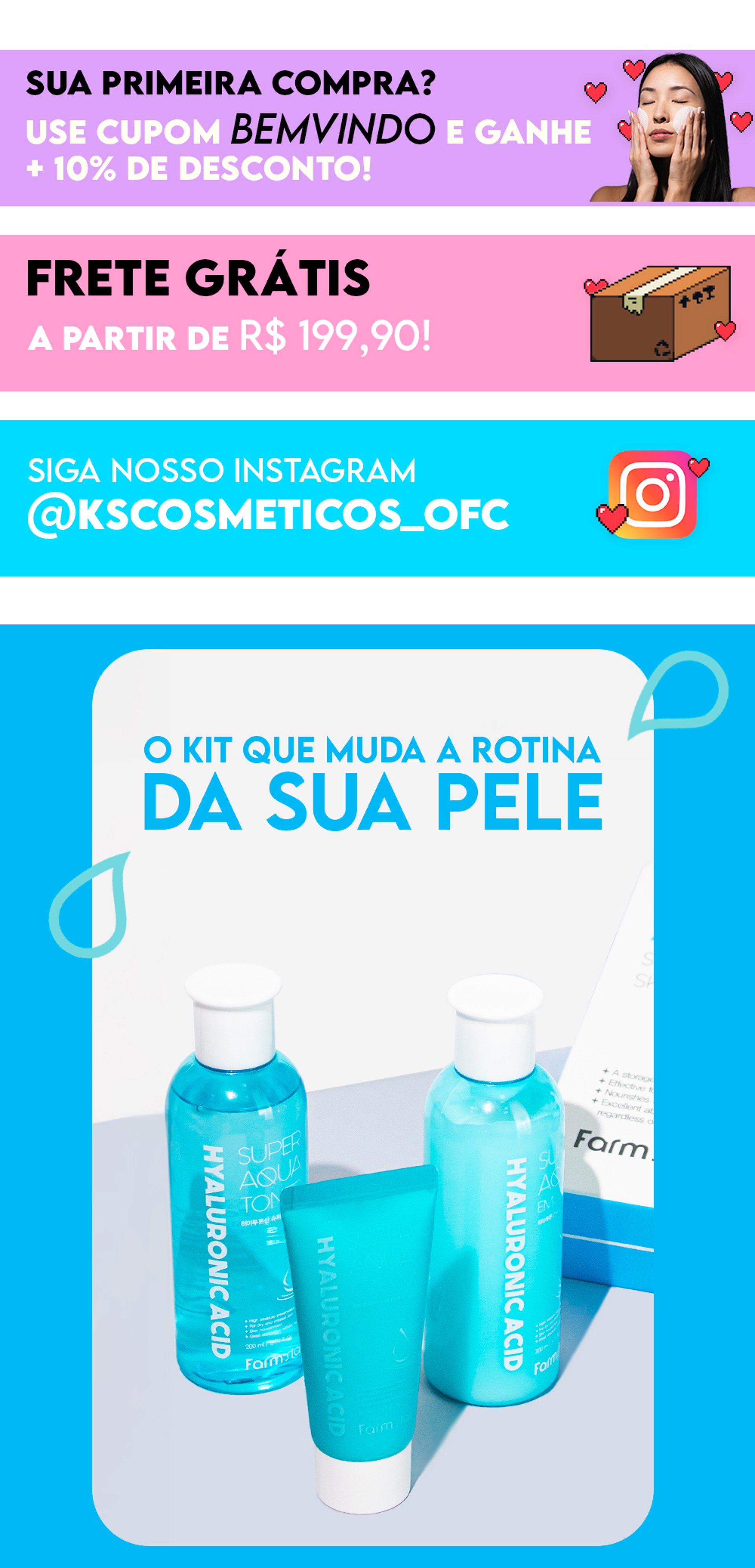 Farmstay Tônico de Ácido Hialurônico200mlApós a limpeza, aplique uma quantidade adequada do produto no rosto e massageie até absorver.Farmstay Emulsão de Ácido Hialurônico200mlApós o tônico, aplique uma quantidade adequada do produto no rosto e espalhe suavemente para absorver na pele.Farmstay Creme...