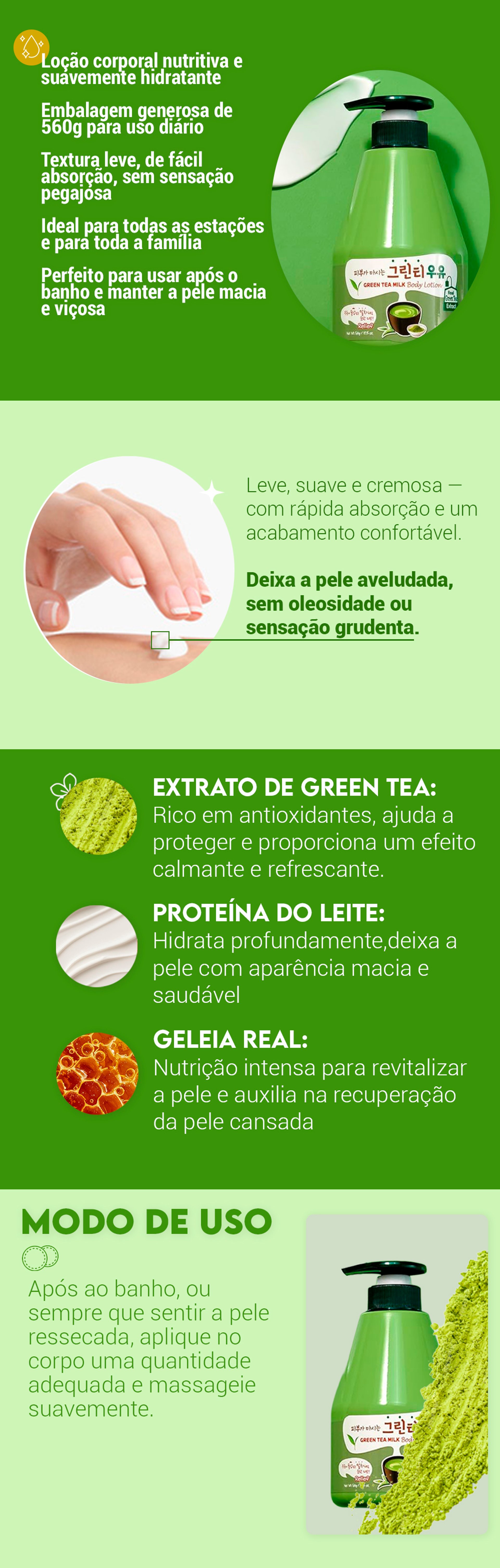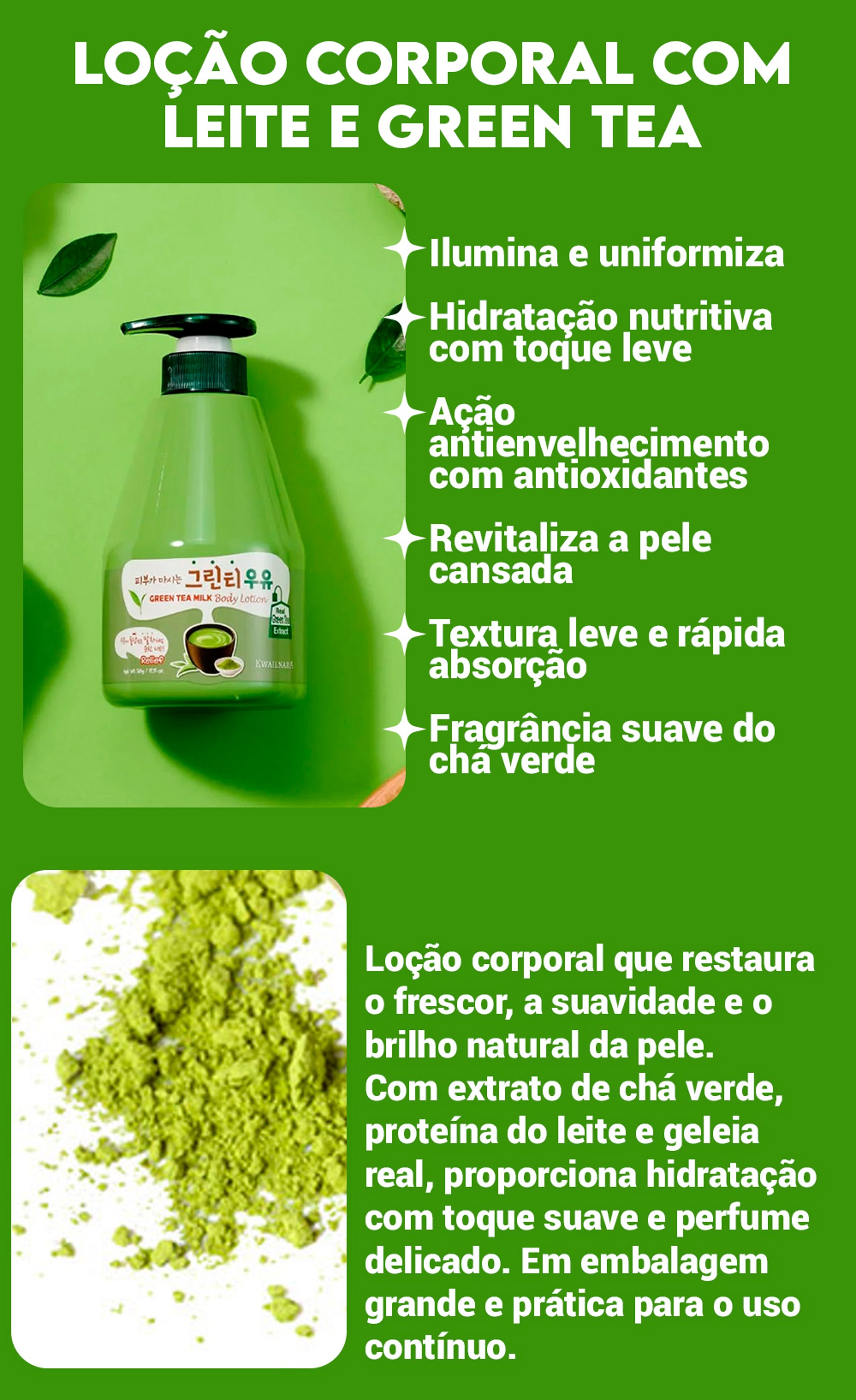Loção Corporal de Chá Verde com Leite!Repleta da energia verde e da hidratação da natureza, essa loção contém extrato concentrado de chá verde.Sinta na pele a maciez e hidratação como se tivesse feito uma máscara de leite com chá verde!- Rica em vitalidade e umidade com extrato de chá verde, absorve facilmente sem deixar a pele pegajosa.- Os extratos de chá verde e geleia real ajudam a manter a hidratação da pele e deixam a textura suave e confortável.- Após o banho, aplique na pele seca a quant...