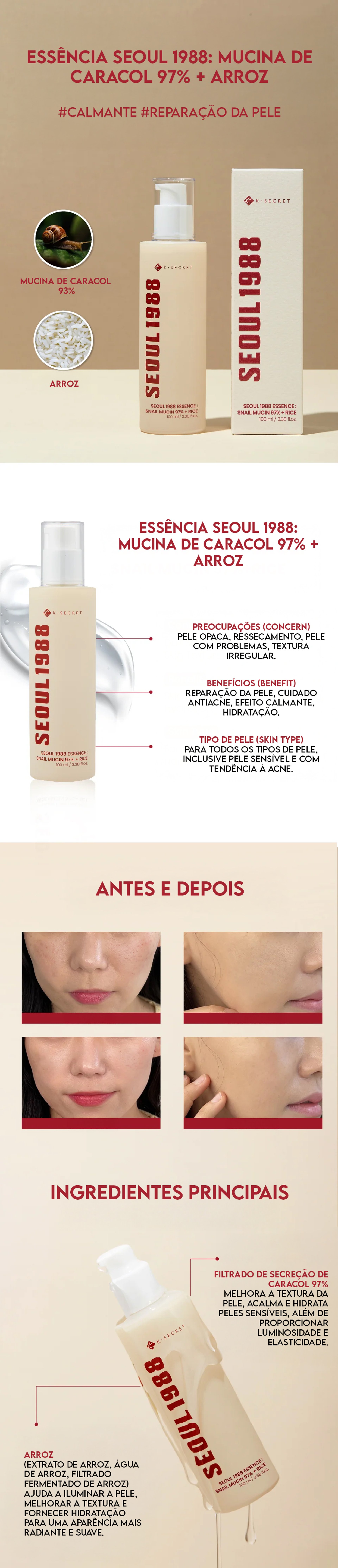 A K-Secret Seoul 1988 Essence Snail Mucin 97% + Rice é uma essência poderosa que transforma a pele com hidratação profunda e efeito reparador 💜Com alta concentração de mucina de caracol e extrato de arroz, ela melhora a elasticidade, uniformiza o tom e devolve aquele glow saudável ✨Perfeita para quem busca uma pele mais lisa, hidratada e rejuvenescida 🌿💎 Por que você vai amar:✨ Hidrata profundamente e mantém a pele macia✨ Melhora a elasticidade e firmeza✨ Uniformiza o tom da pele✨ Ajuda na re...