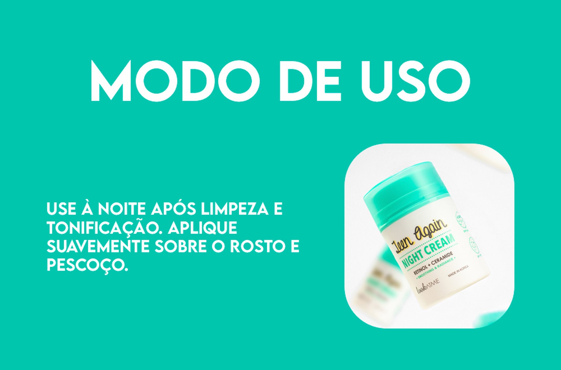 Use à noite após limpeza e tonificação. Aplique suavemente sobre o rosto e pescoço.