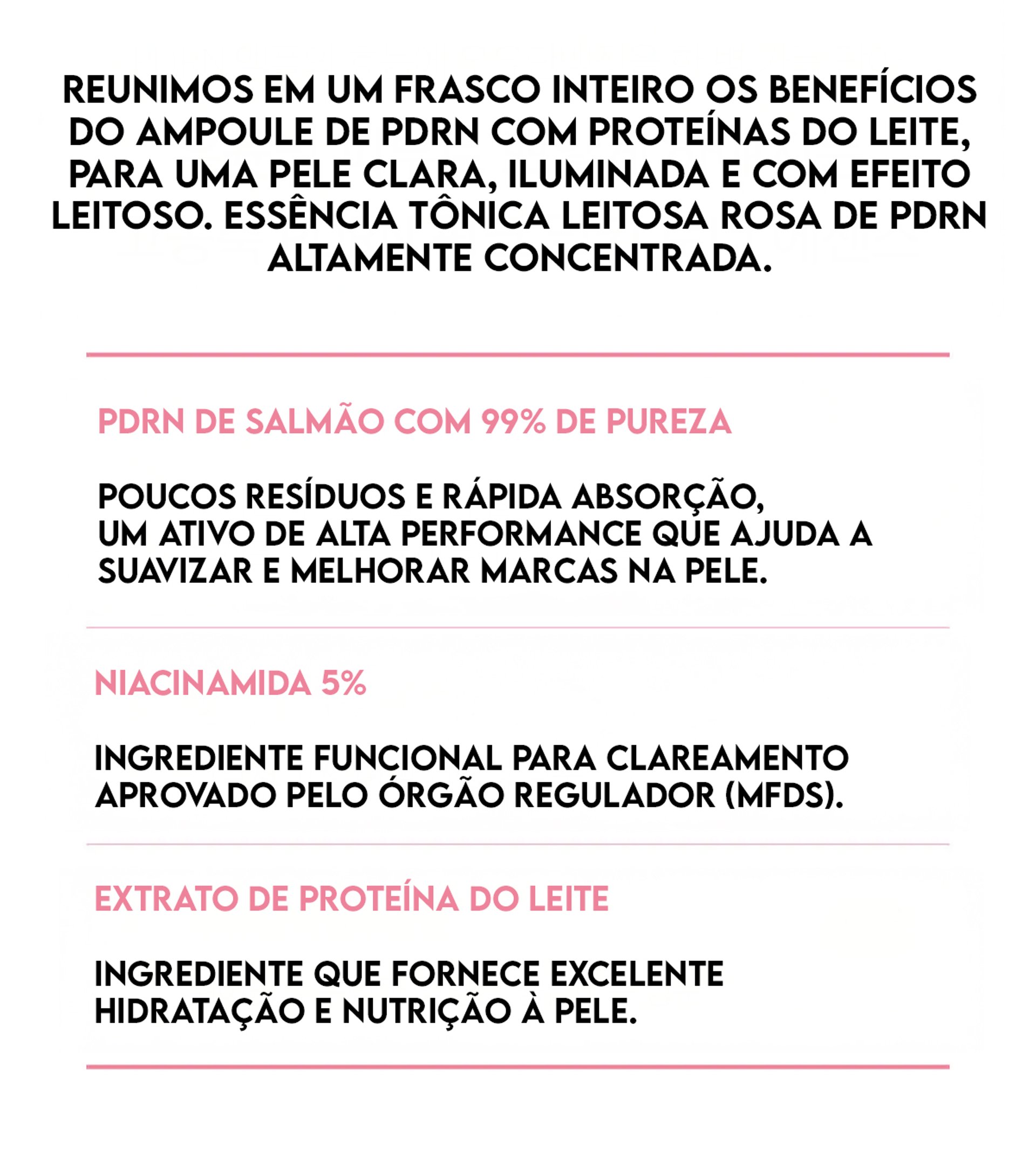 Água, Glicerol, Nicotinamida, Etilcaproato De Cetila, Triglicerídeo Caprílico/Cáprico, Diestearato De Poliglicerila-3, Citrato De Estearato De Glicerila, Palmitato De Etilexila, 1,2-Hexanodiol, Tetraetilexanoato De Pentaeritritila, Octildodecanol, Malato De Diisostearila, C12-14 Alquete-12crospolímero De Acrilatos/Acrilato De Alquila C10-30, Trometamina, Etilhexilglicerina, Monoestearato De Glicerila, Trealose, Adenosina, Edetato Dissódico, Cianocobalamina, Hidrolisado De Sacarídeo, Óleo Da Semente De Amêndoa-Amarga, Extrato Da Folha De Chá-Da-Índia, Extrato Da Folha De Maçã, Extrato De Baunilha, Água Da Flor Do Jasmim, Extrato De Proteína De Leite, Dipropilenoglicol, Oleato De Poliglicerila-10, Extrato Da Folha De Centella Asiática, Extrato Da Raiz De Centella Asiática, Extrato De Centella-Asiática, Pentileno Glicol, Madecassosídeo, Butileno Glicol, Ácido Asiático, Asiaticosídeo, Ácido Madecássico, Água De Farelo De Arroz, Ceramida Np, Ceramida Ns, Ceramida Eop, Ceramida Ap, Proteína De Soja Hidrolisada, Proteína De Arroz Hidrolisada, Proteína De Milho Hidrolisada, Proteína De Trigo Hidrolisada, Proteína De Farelo De Arroz Hidrolisada, Óleo Do Farelo De Arroz, Sorbitol, Óleo Da Semente De Girassol, Estearato De Sacarose, Betacaroteno, Tocoferol, Pantenol, Xilitilglicosídeo, Anidroxilitol, Xilitol, Extrato De Cavalinha, Extrato De Lycopodium Clavatum, Propanodiol, Extrato De Mirtilo, Extrato Da Raiz De Kudzu, Extrato De Caniço, Extrato De Trevo Vermelho, Extrato Do Fruto De Amendoeira, Extrato Da Casca De Ipê-Rosa, Extrato De Tremella Fuciformis, Lecitina, Aceglutamida, Extrato Do Fermento De Soja/Bacillus, Caprililglicol, Ácido Fólico, Hialuronato De Sódio, Oligopeptídeo-1, Oligopeptídeo-2, Oligopeptídeo-3, Hexapeptídeo-11, Palmitoil Pentapeptídeo-4, Ácido Desoxirribonucleico Sódico.