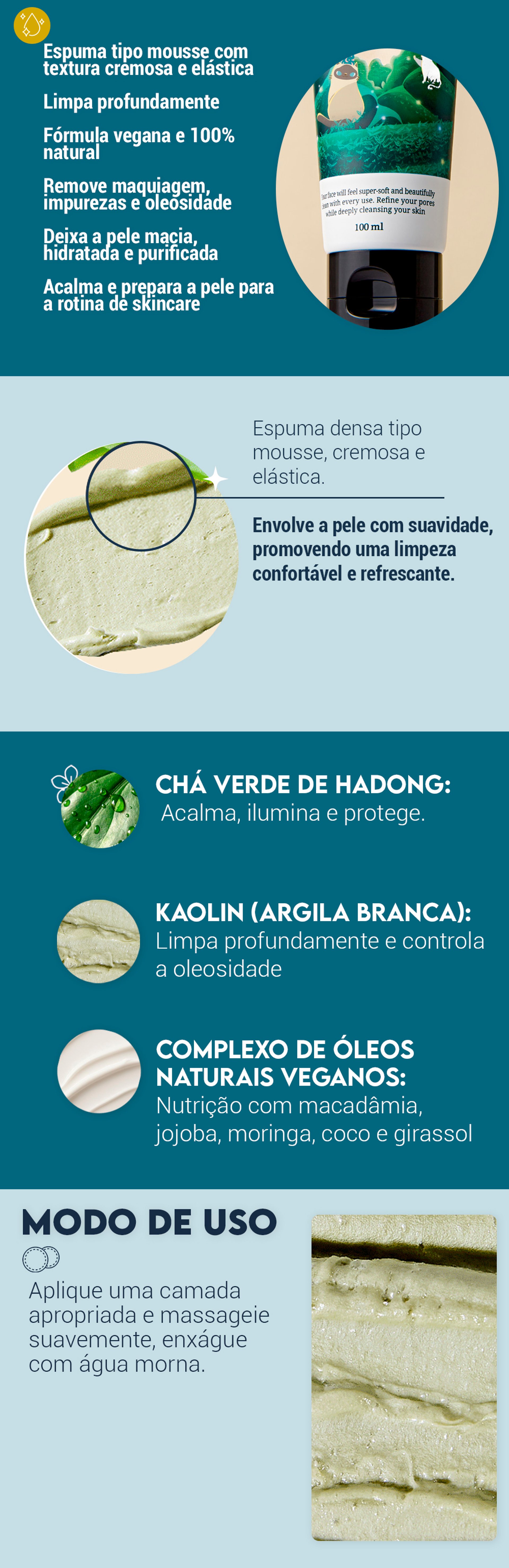 Glicerol, Água, Cocoil isetionato de sódio, Água da folha de chá-da-Índia, Coco-betaína, Ácido de coco, Ácido palmítico, Ácido estárico, Isetionato de sódio, 1,2-Hexanodiol, Xilitilglicosídeo, Caprililglicol, Ácido cítrico, Anidroxilitol, Etilhexilglicerina, Extrato da folha de cinamomo, Xilitol, Poliquatérnio-10, Extrato de malte, Extrato da flor de cinamomo, Alantoína, Óleo da semente de amêndoa-amarga, Glicose, Extrato da folha/tronco de hera, Edetato dissódico, Extrato de maçã, Pantenol, Água da flor do jasmim, Extrato de baunilha, Óleo de coco, Óleo da semente de girassol, Caulim, Pó de pérola, Óleo da semente de jojoba, Esqualano, Óleo da semente de moringa, Óleo da semente de macadamia ternifolia, Óleo vegetal, Butileno glicol, Triglicerídeo caprílico/cáprico, Lecitina hidrogenada, Extrato de brócolis, Extrato de figo, Extrato de tâmara, Lauroil Glutamato de fitoesterila/octildodecila, Ceramida NP, Extrato do fruto de opuntia coccinellifera, Extrato do tronco de opuntia ficus-indica, Extrato da semente de baobá, Tocoferol, Hialuronato de sódio.
