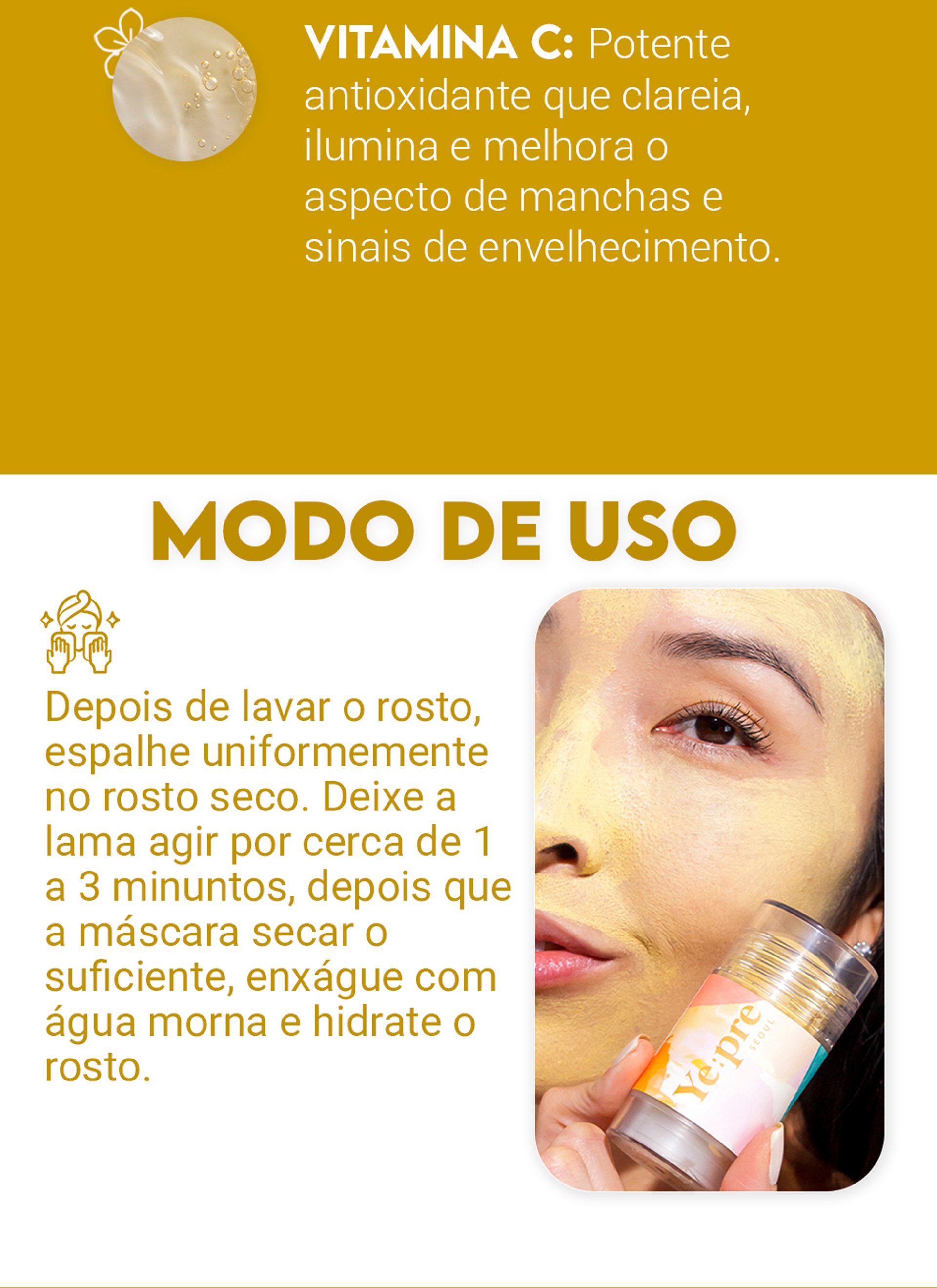 Máscara facial de argila em bastão formulada com vitamina C que cuida dos poros, elimina cravos e células mortas, proporcionando frescor à pele. Indicado para Peles Maduras e/ou com Manchas. ✓ Uniformiza o tom da pele e ilumina.✓ Ação rápida.✓ 100% Vegano.✓ Controla o excesso de sebo.✓ Promove uma limpeza profunda.✓ Remove as células mortas da pele. Importado e Distribuídor por:Shine International Importação e Exportação Ltda.Cnpj: 26.345.821/0001-53AFE/MS: 2.09.223...