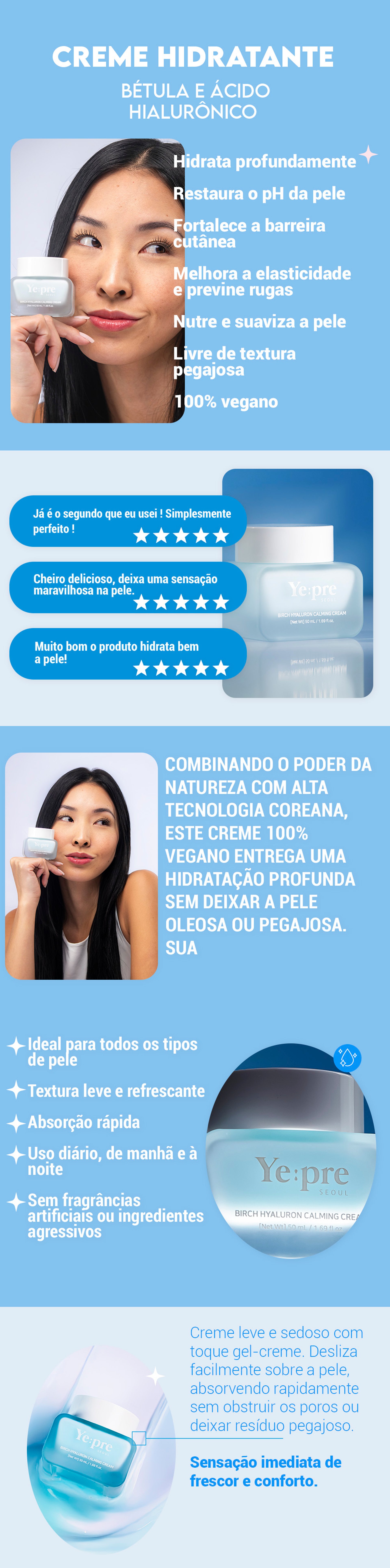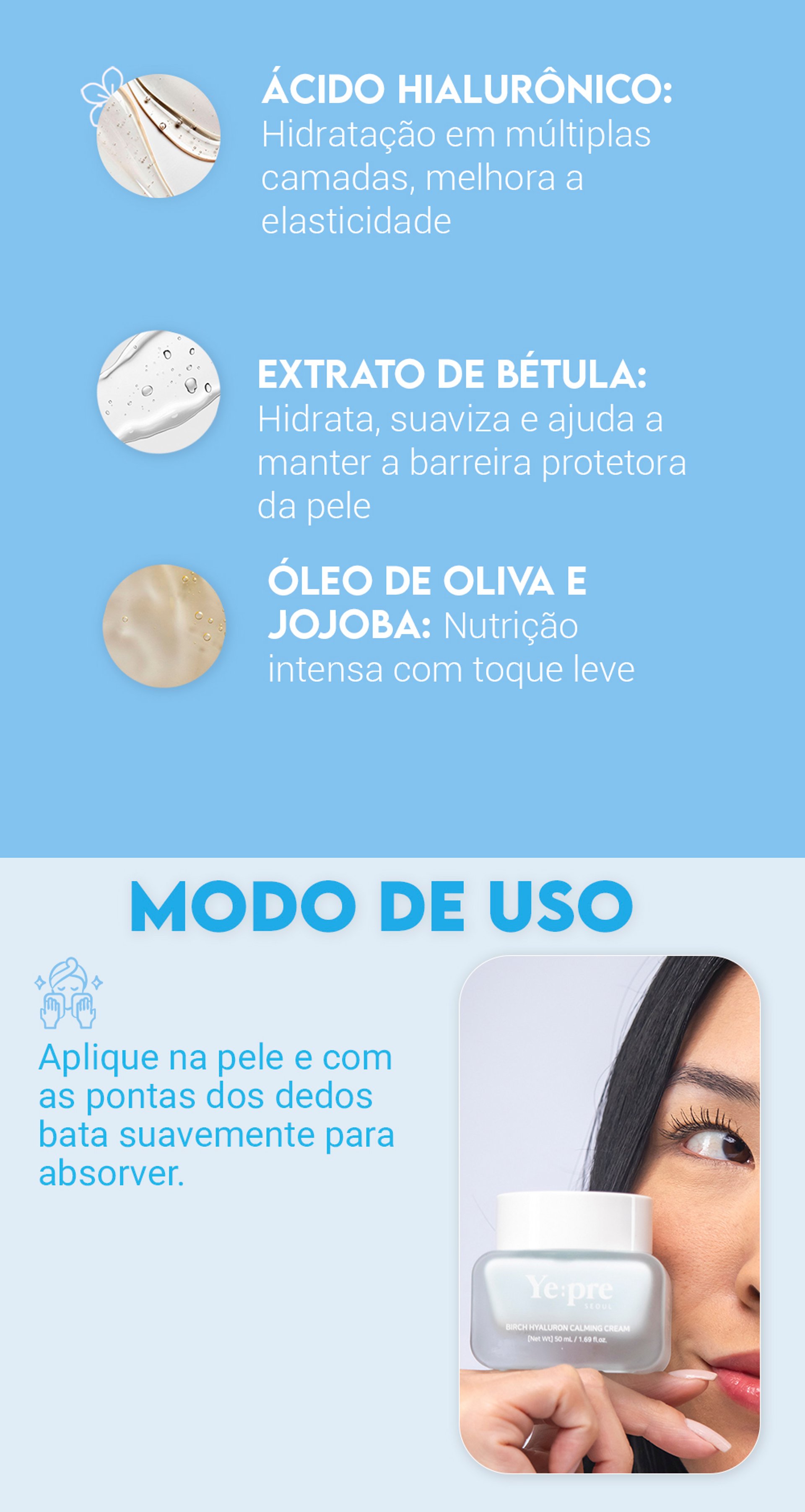 O Yepre Creme Hidratante - Bétula e Ácido Hialurônico foi especialmente desenvolvido para proporcionar hidratação profunda, mantendo sua pele macia, renovada e protegida. Sua fórmula enriquecida com extrato de Betula e Ácido Hialurônico ajuda a preservar a hidratação e fortalecer a barreira cutânea, prevenindo a perda de água e deixando a pele visivelmente mais firme.Além disso, o extrato de Aloe Vera acalma e refresca, enquanto os óleos de Oliva e Jojoba oferecem nutrição intensa, mantendo a pe...