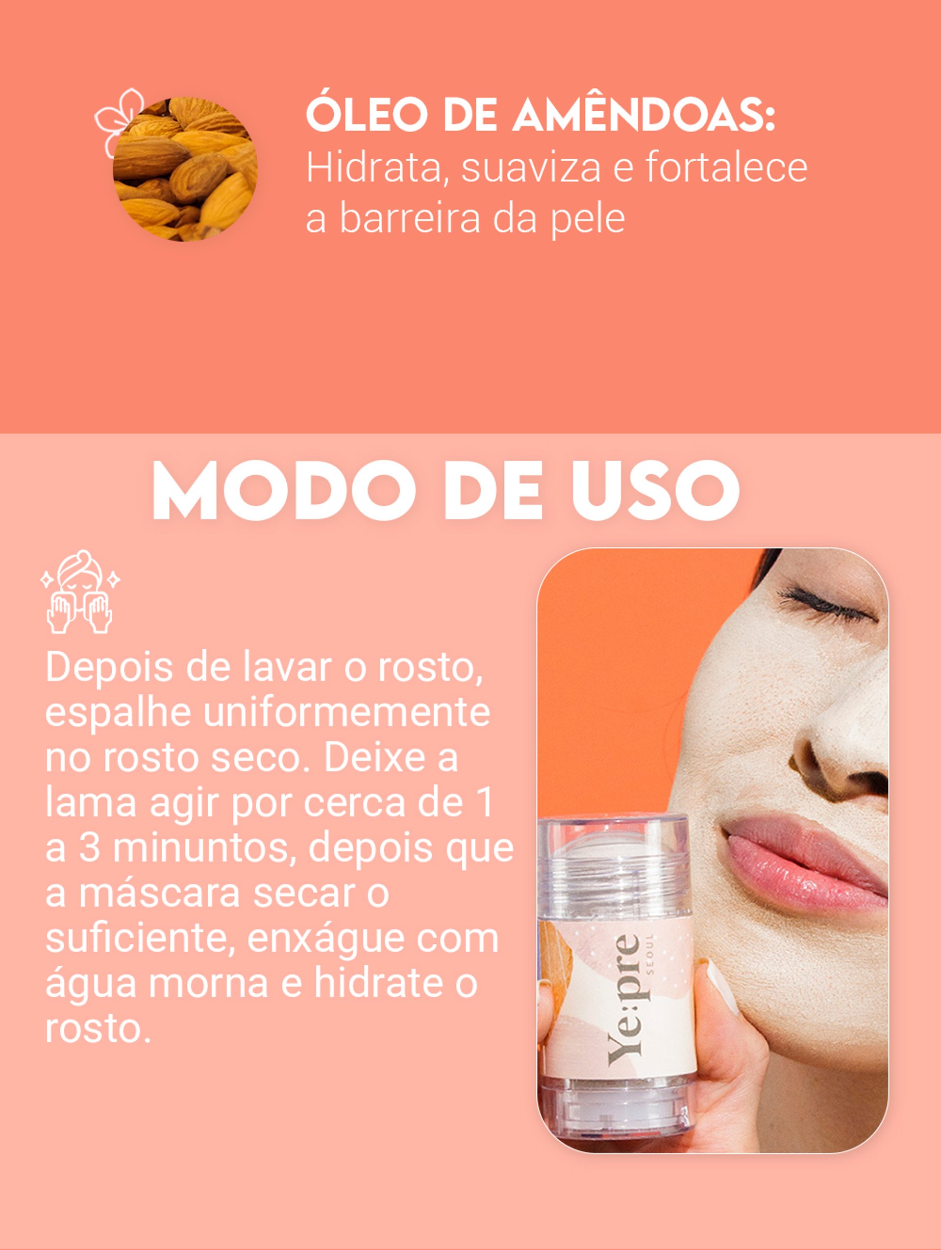 Depois de lavar o rosto, espalhe uniformemente no rosto seco. Deixe a lama agir por cerca de 1 a 3 minuntos, depois que a máscara secar o suficiente, enxágue com água morna e hidrate o rosto.
